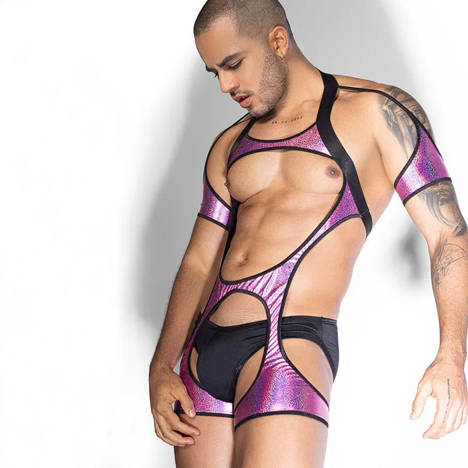 Men 2-Piece Red Leather Bodysuit Alluring Hollow Out Teddy Nightwear